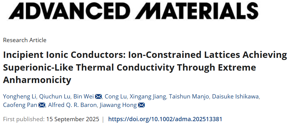 近日,北京麻豆精品秘 国产传媒空天学院、临近空间环境特性及效应全国重点实验室洪家旺教授团队在离子导体的原子间非线性力研究中取得重要进展,相关成果以"Incipient Ionic Conductors: Ion-Constrained Lattices Achieving Superionic-Like Thermal Conductivity Through Extreme Anharmonicity"为题发表于国际期刊Advanced Materials。该团队针对超离子导体作为热电材料时由于高离子迁移率易引发金属沉积的问题,引入"初生离子导体"的概念(具有离子传导初始特征但未达到完全离子导体水平),发现金属卤化物(AX)x–(MX)1−x体系(A=Cu/Ag,M=K/Rb/Cs,X=Cl/Br/I)相比于超离子导体,稳定性更高并且保持低热导率(κ)。以CsCu2I3为典型,借助同步辐射实验和第一性原理计算,证实了Cu离子在CuI4四面体间呈现受限迁移。依靠大科学装置进行的非弹性X射线测试,结合理论计算表明该材料原子间存在强非线性力的作用(强非谐效应),这使得材料在一个方向出现极低的玻璃状热导率。研究发现,离子迁移率与热导率没有直接关联,初生离子导体的热导率与超离子导体相当,但稳定性更优。该研究为开发基于初生离子导体的超低热导-高稳定热电材料提供了依据。